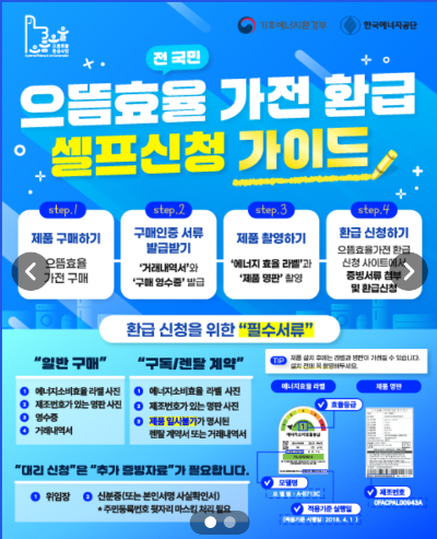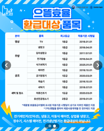 에너지 효율이 높은 1등급 가전제품을 구매한 개인 소비자에게 구매 금액의 최대 10%를 환급해주는 제도로, 한국에너지공단이 주관합니다.