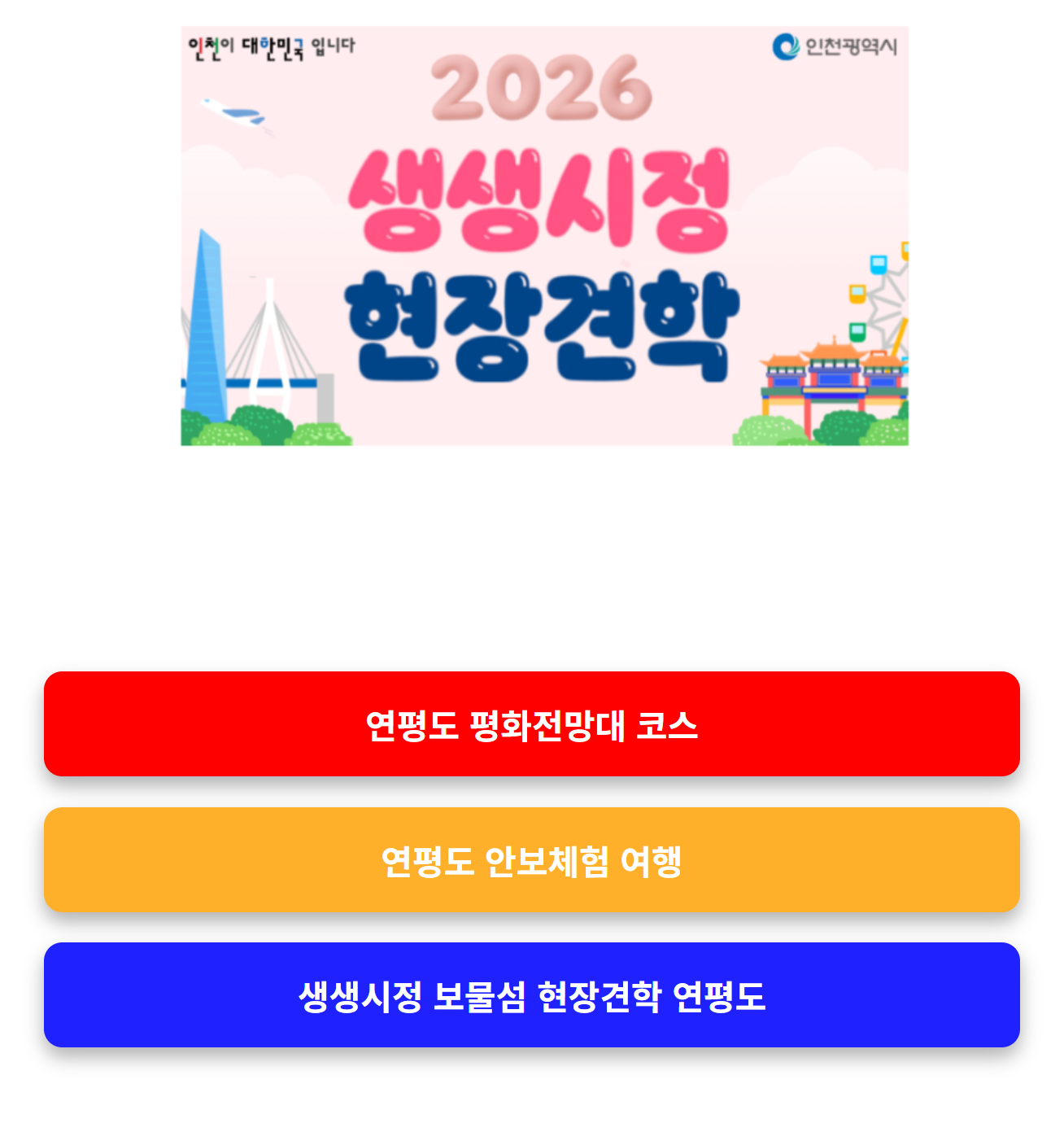 연평도 평화전망대 코스를 포함한 현장견학 프로그램은 인천시 홈페이지에서 신청할 수 있습니다.