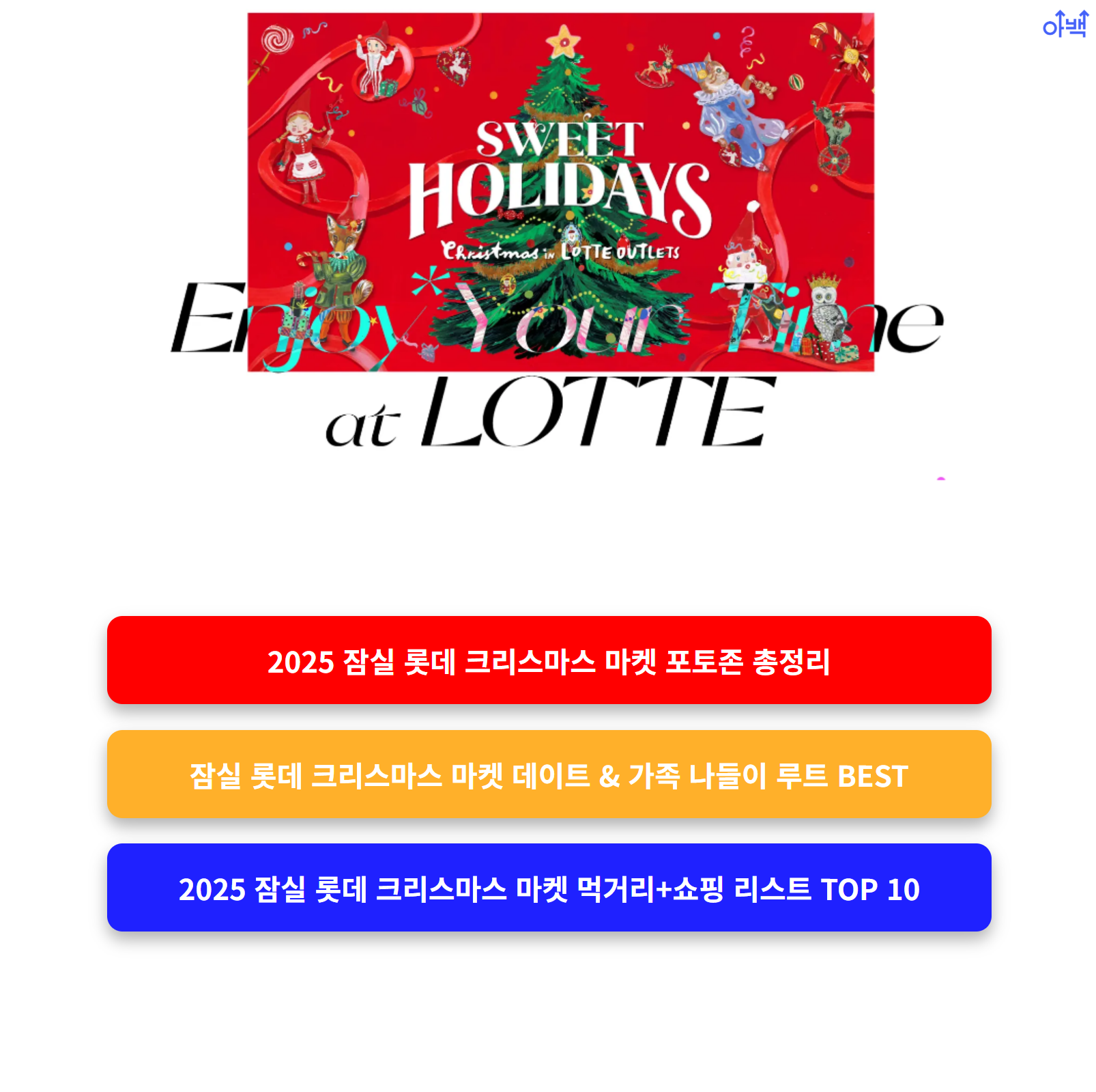 추운 계절이지만 마음만은 따뜻해지는 시간. 잠실 롯데 크리스마스 마켓은 단순한 쇼핑 공간이 아닌, '경험'과 '감성'을 사는 곳입니다. 연인, 가족, 친구와 함께한 하루는 분명히 오래도록 기억에 남을 겁니다. 이번 겨울, 한 번쯤은 반짝이는 마켓에서 추억을 만들어보세요.