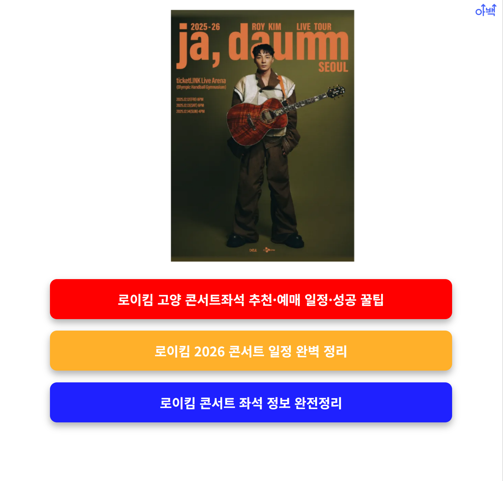 이 글에서는 예매 일정, 좌석 구성, 가격, 추천 구역, 예매 꿀팁까지 2025-26 로이킴 콘서트 고양 공연에 대한 모든 정보를 안내드립니다👇