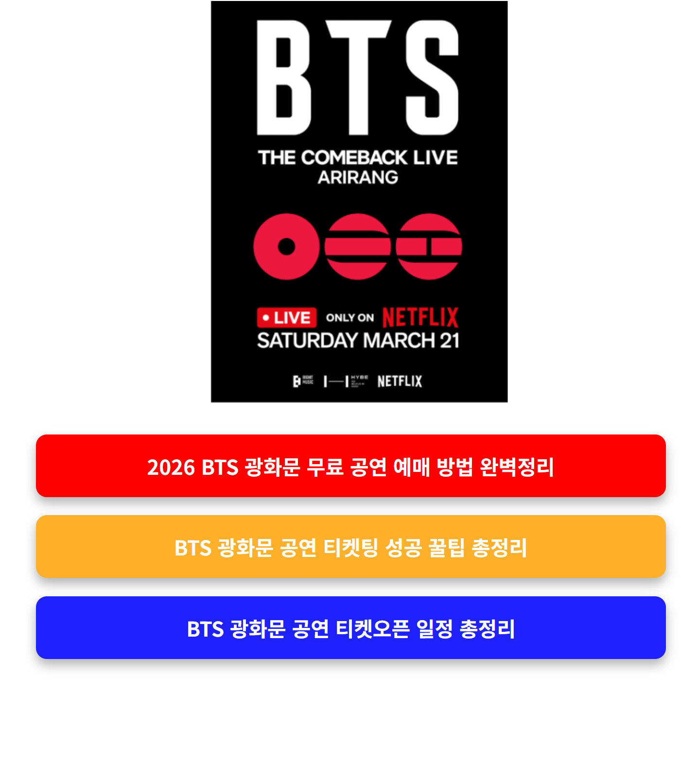2026년 3월 21일, 서울 광화문광장에서 열리는 BTS 광화문 공연이 공식 발표되었습니다. 공연명은 BTS 컴백 라이브 ARIRANG. 단 하루 진행됩니다. 공연 시간은 오후 8시입니다. 약 60분간 진행됩니다.