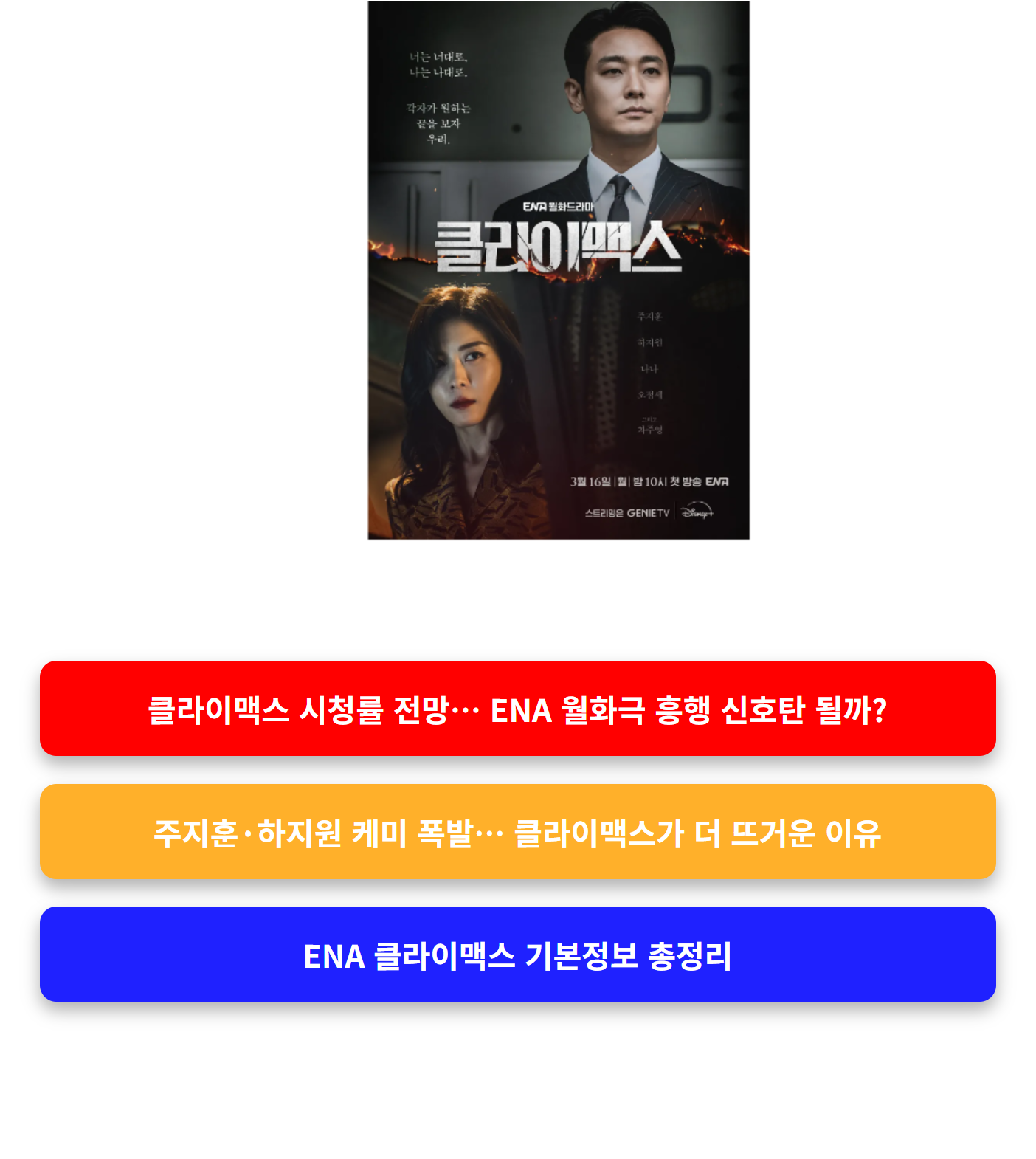 최근 ENA는 장르물 흥행 사례를 만들어온 채널입니다. 클라이맥스 역시 이 흐름을 이어갈지 관심이 집중되고 있습니다.