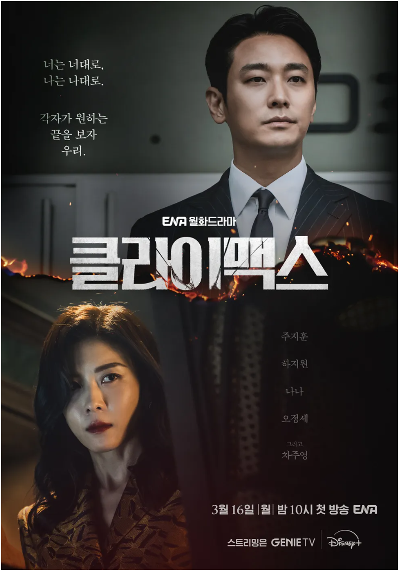 클라이맥스는 3월 16일 월요일 첫 방송을 시작으로 매주 월·화 밤 10시에 방송됩니다. 방영 채널은 ENA입니다.
